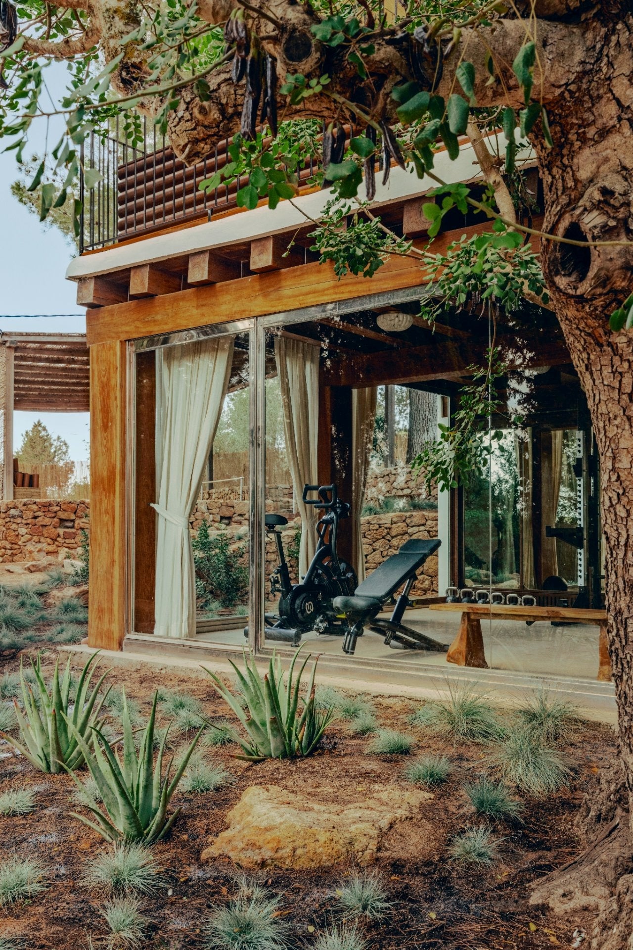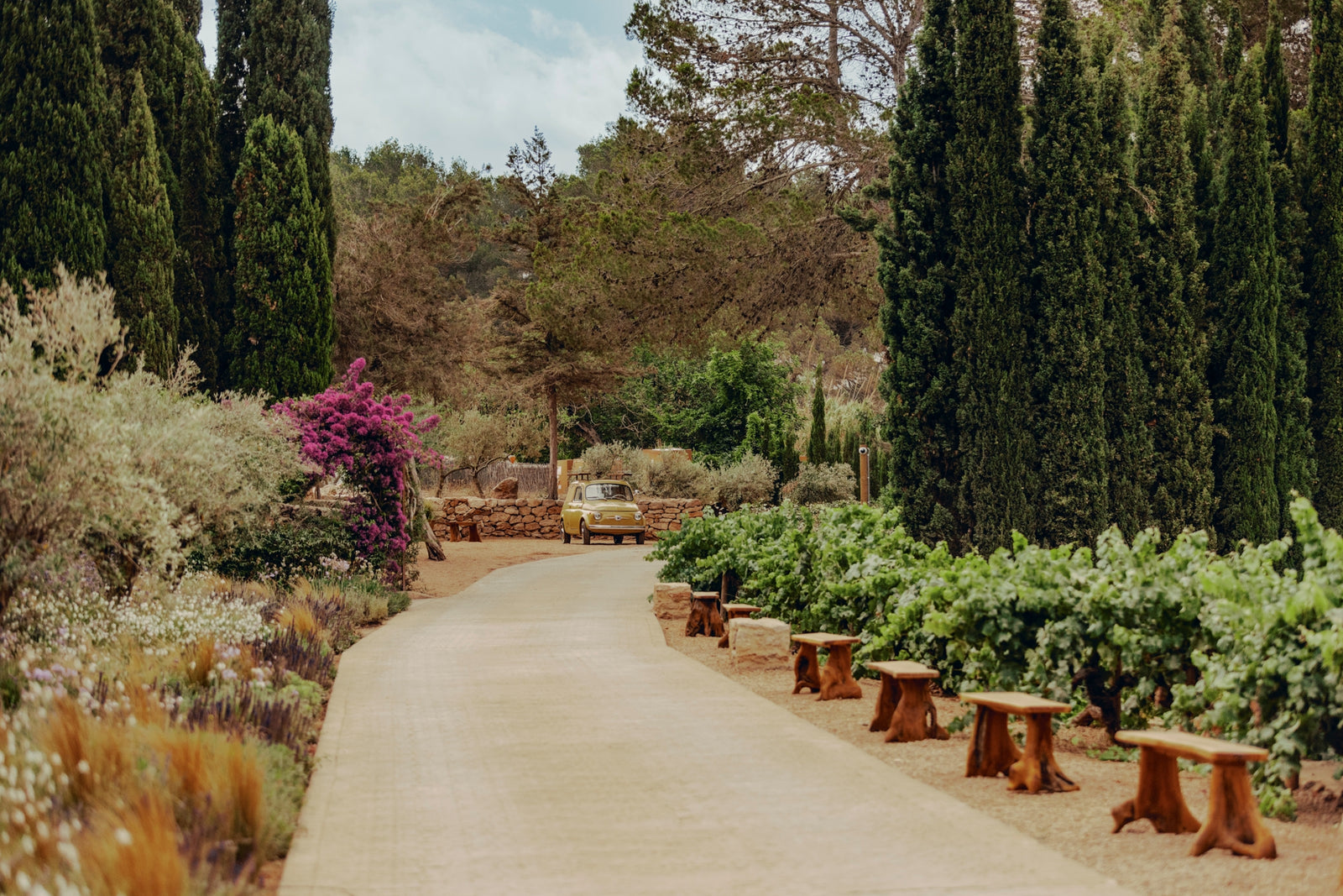 Soho Farmhouse Ibiza’s entrance feels unmistakably Mediterranean: whitewashed walls, warm stone, and bold planting that frames the facade. Tall palms add height and shade, while bougainvillea climbs up the walls for a burst of colour. An old olive tree anchors the space, surrounded by drought-tolerant shrubs and soft grasses for an easy, natural look.